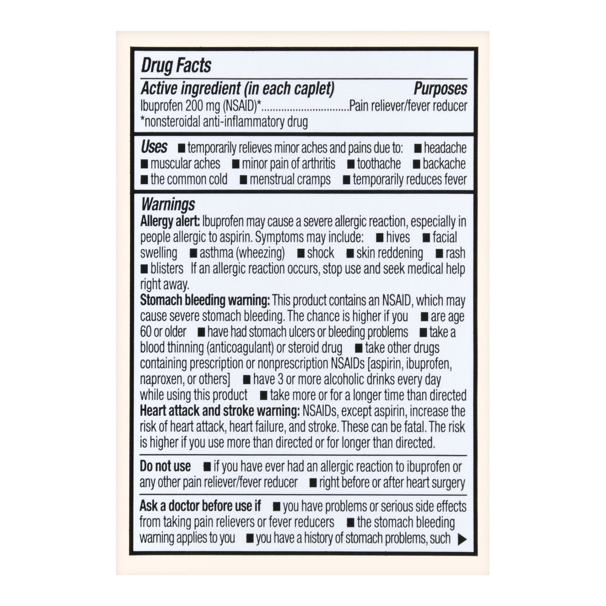 - These 200 mg ibuprofen caplets provide temporary pain relief in mild to moderate cases and reduce fever.