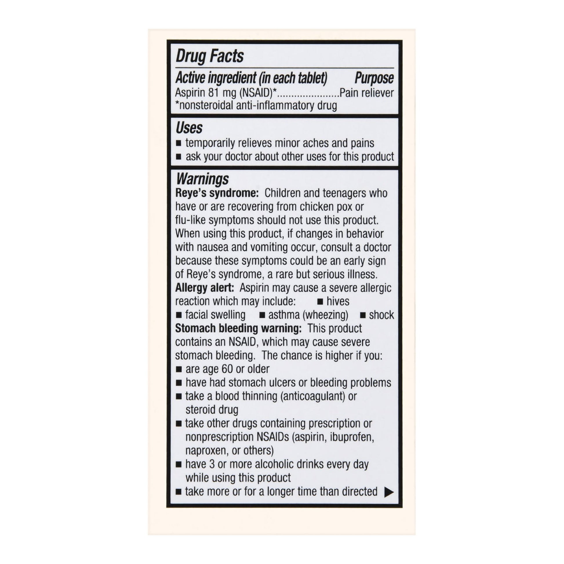 - There are 81 milligrams of aspirin – the original wonder drug – in each tablet.