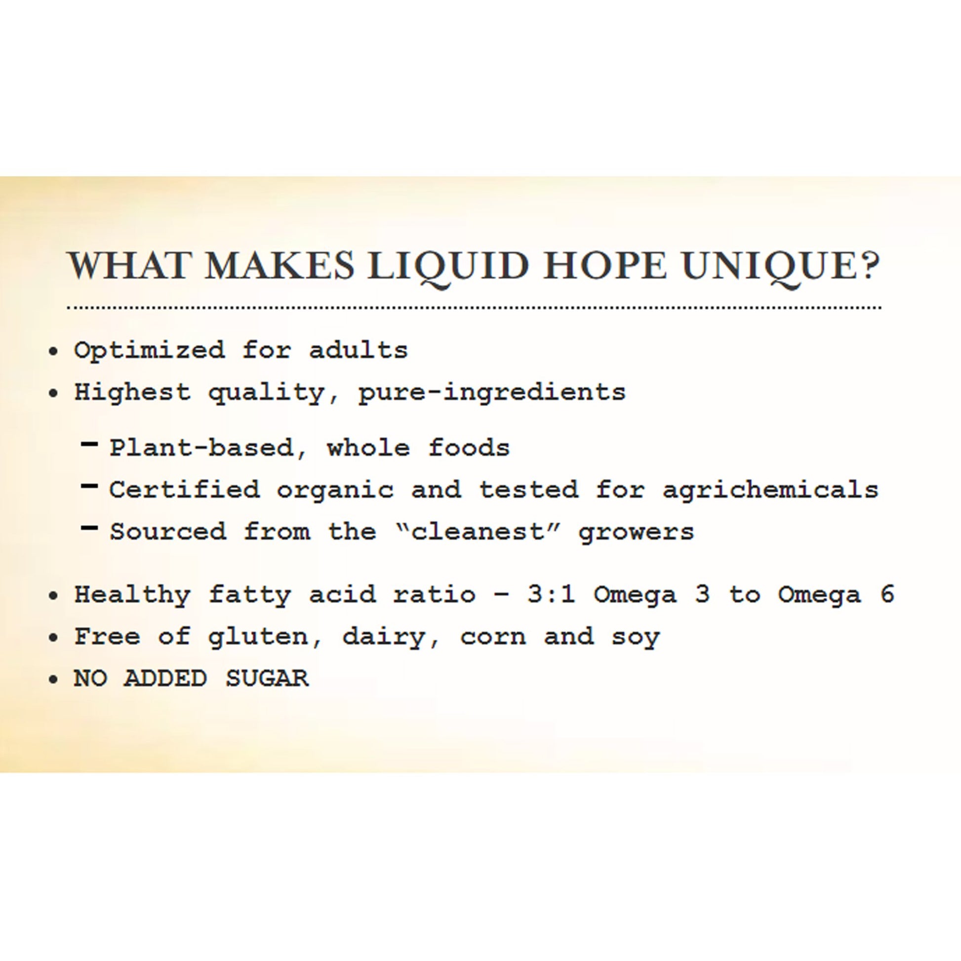 - Liquid Hope has a 2-year shelf life but has no preservatives