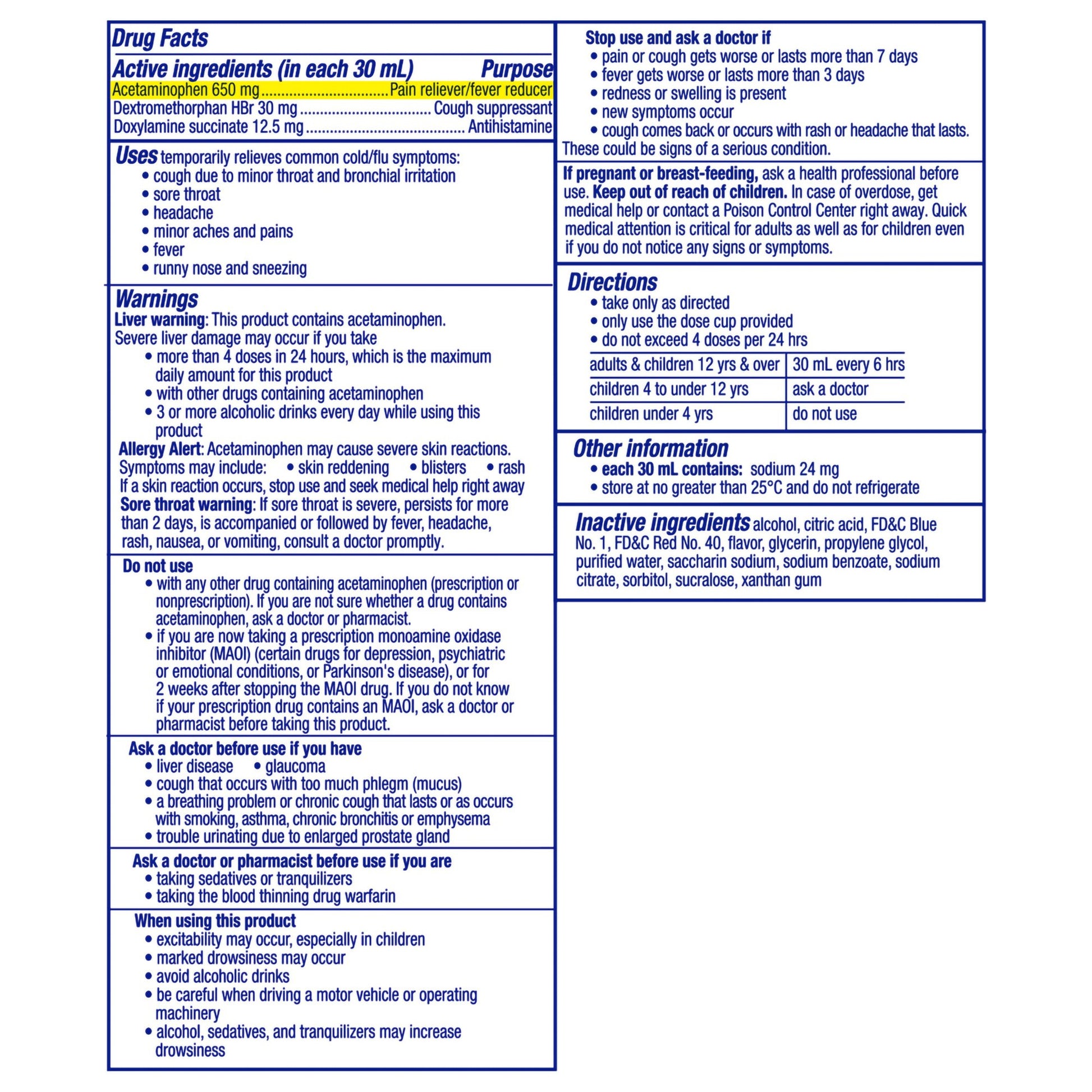 - Nyquil Cold and Flu contains 10% alcohol but its active ingredients are acetaminophen for pain relief and fever reduction; dextromethorphan to suppress coughs; and doxylamine succinate to help you sleep – because, more often than not, rest is the best healer.