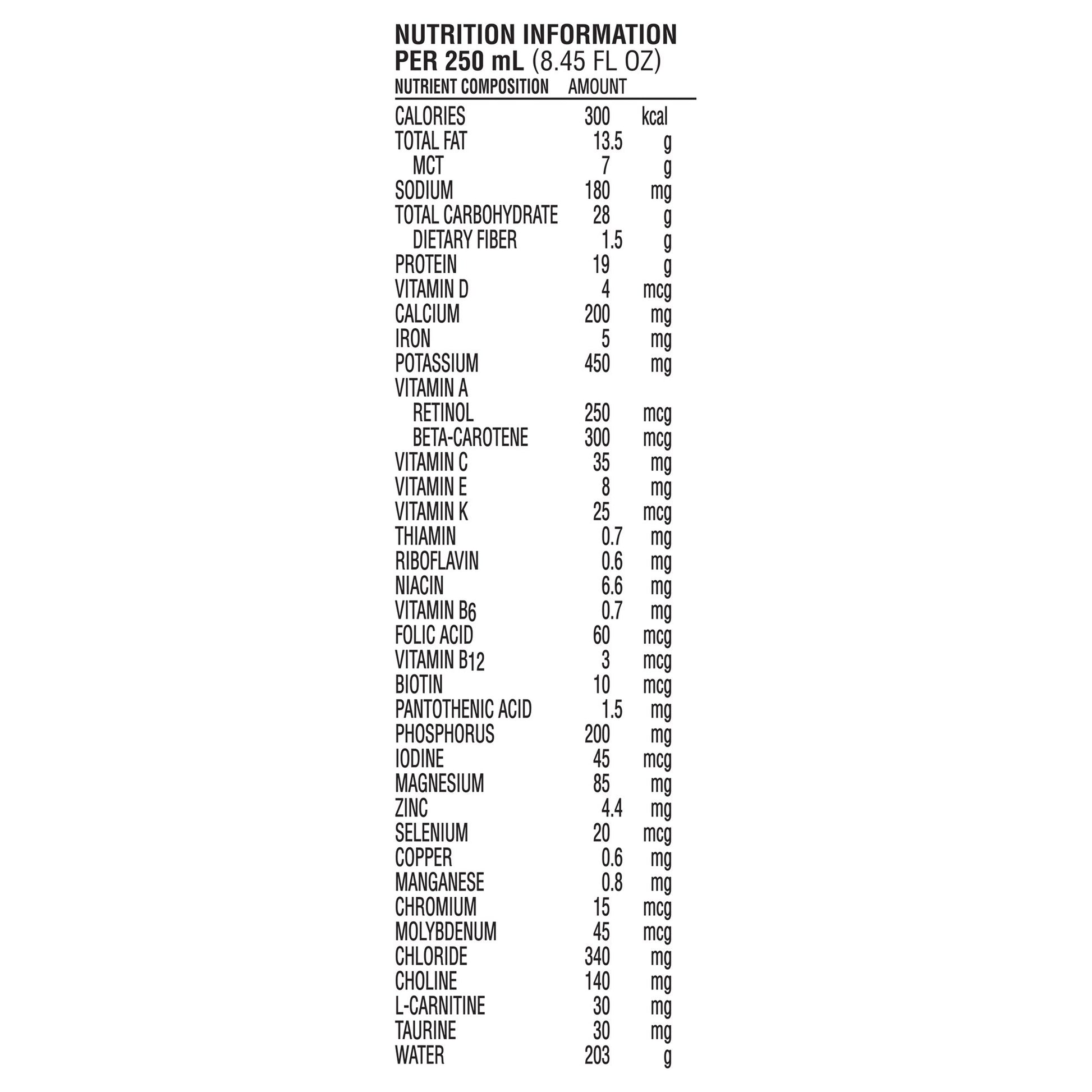 - Carton contains 250 mL of specialized enteral nutrition formula.