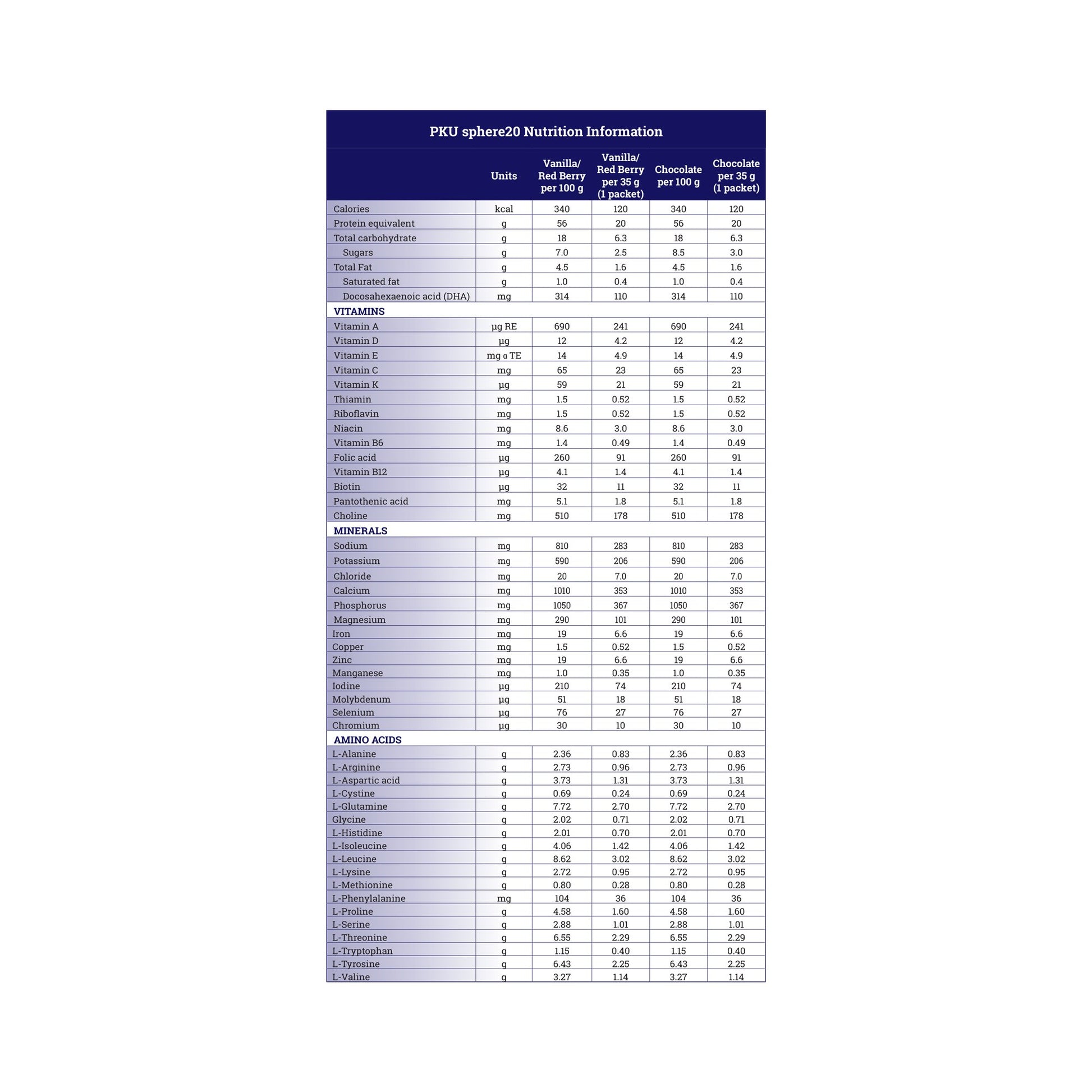 - There are 30 35-gram packets of chocolate flavor low phenylalanine formula.