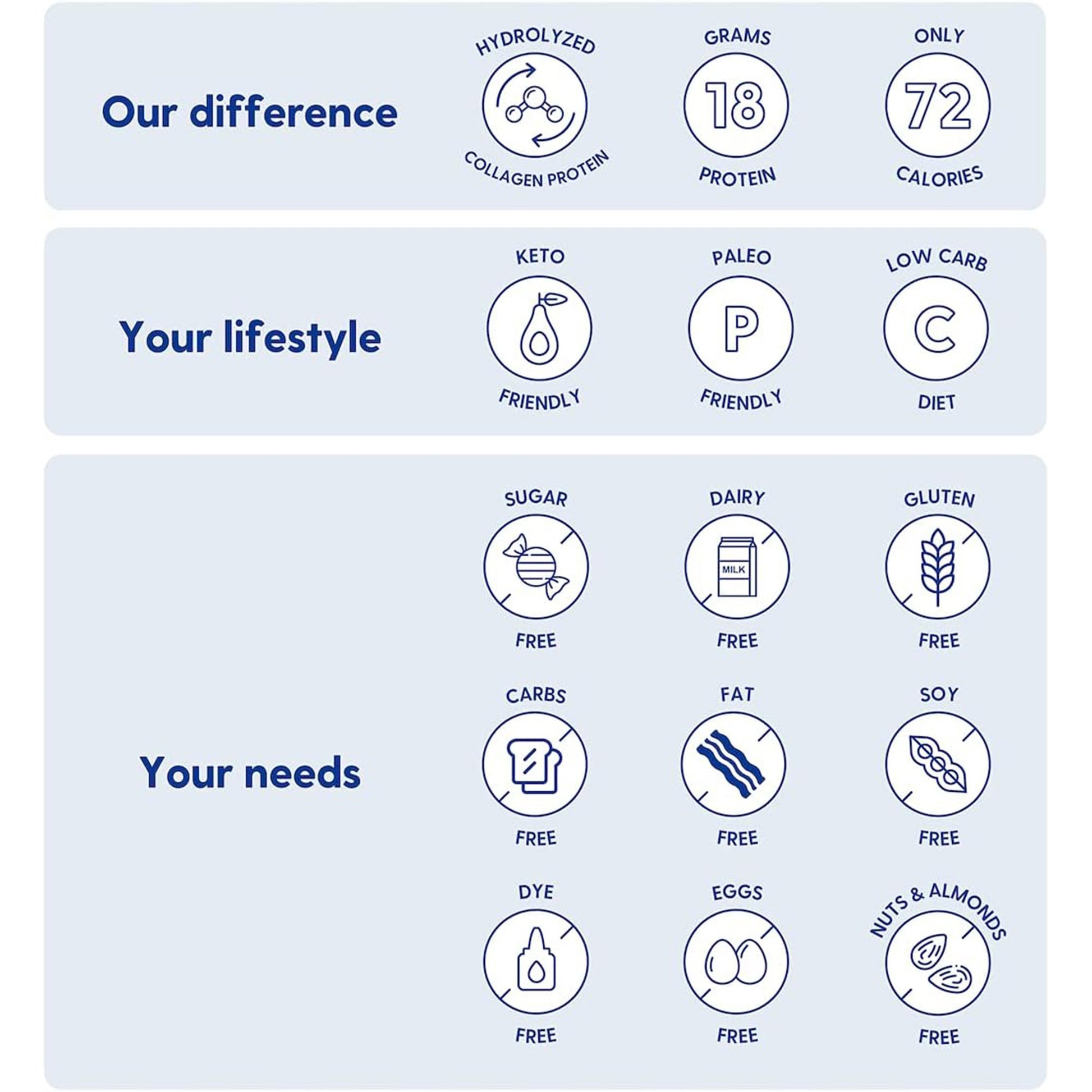 - Free of fat, sugar and other carbohydrates, as well as the most common allergens such as dairy, gluten, soy, eggs and nuts