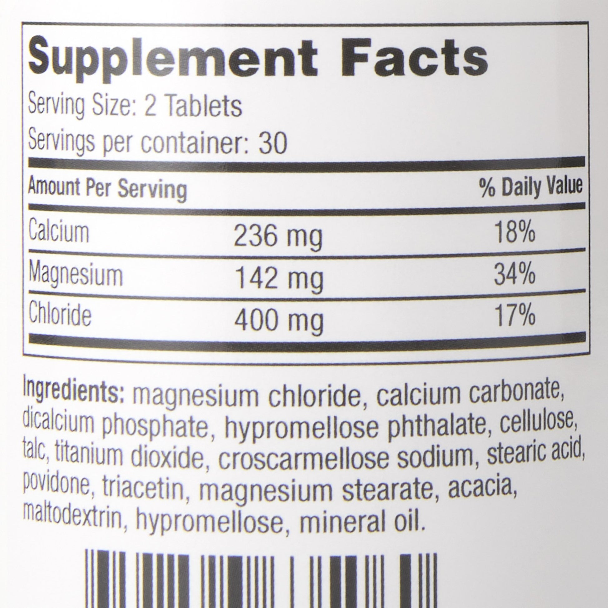 - 236 milligrams of calcium; 142 milligrams magnesium and 400 milligrams of chloride per tablet
