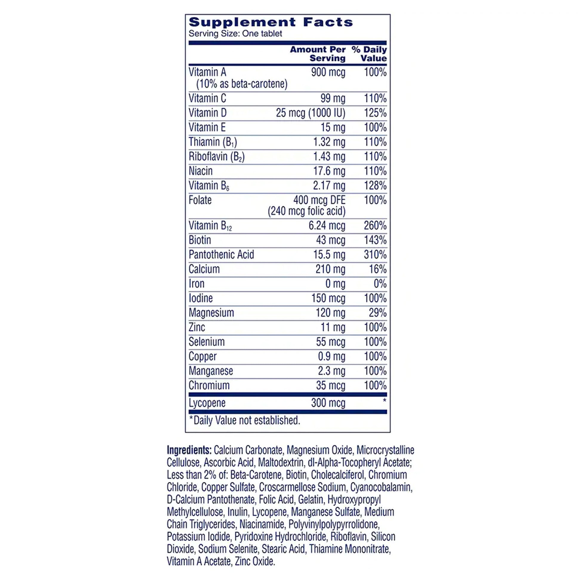 - One tablet of this multivitamin/multimineral contains 900 micrograms of vitamin A (10% as beta-carotene); 99 milligrams of vitamin C; 25 micrograms of vitamin D; 15 milligrams of vitamin E; 30 micrograms of vitamin K; 1.32 milligrams of thiamin (vitamin B-1); 1.43 milligrams of vitamin B-2 (riboflavin); 17.6 milligrams of niacin; 2.17 milligrams of vitamin B-6; 240 micrograms of folic acid; 6.24 micrograms of vitamin B-12; 43 micrograms of biotin; 15.5 milligrams of pantothenic acid; 210 milligrams of calcium; 120 milligrams of magnesium; 11 milligrams of zinc; 55 micrograms of selenium; 0.9 milligrams of copper; 2.3 milligrams of manganese; 35 micrograms of chromium; 300 micrograms of lycopene; calcium carbonate; and magnesium oxide